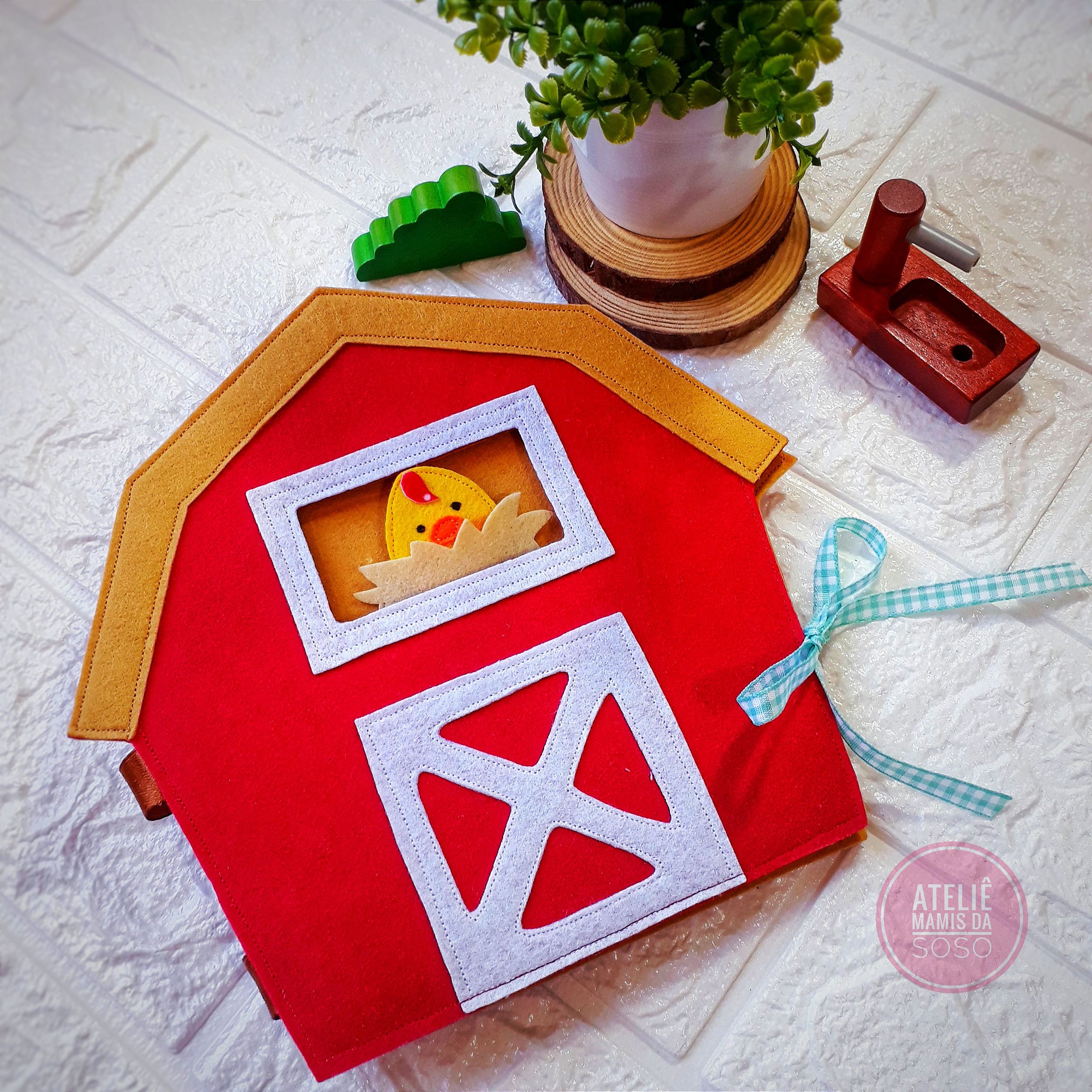 Livro em formato de celeiro com bichinhos da fazenda muito fofinhos, e coloridos.